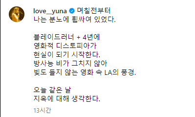 김윤아는 24일 밤 인스타그램에 "며칠 전부터 나는 분노에 휩싸여 있었다"며 그의 감정을 드러냈습니다. 그는 이어서 "블레이드러너 + 4년에 영화적 디스토피아가 현실이 되기 시작한다. 방사능 비가 그치지 않아 빛도 들지 않는 영화 속 LA의 풍경"이라며 디스토피아를 그린 SF영화의 풍경을 상기시켰습니다.