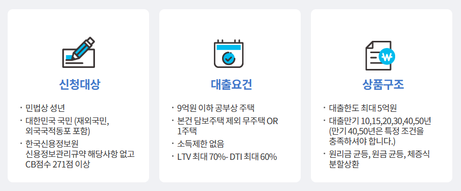 주택가격이 9억원 이하면 소득 제한 없이 최대 5억원까지 대출 가능