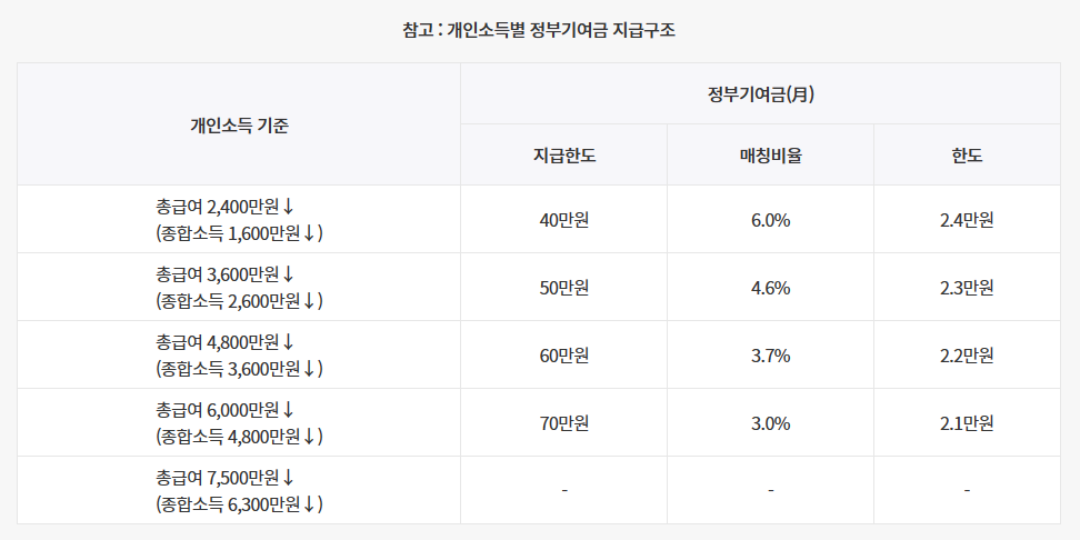 청년 자산 형성을 위하여 정부기여금이 지급되는 상품으로, 만기 5년 동안 매월 70만원 한도내에서 원하는 금액을 납입하면 매월 최대 6%의 정부기여금을 지급하고 이자 소득에 대한 비과세 혜택을 제공하는 제도입니다. 저소득층 청년 대상 일정수준의 우대금리도 제공 됩니다.